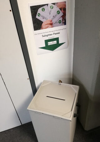 - Wer seine Leistungen vom Jobcenter Salzgitter bezieht, erhält mit seinem Bewilligungsbescheid ein Antragsformular. Der ausgefüllte und unterschriebene Antrag muss in den speziell für diesen Zweck aufgestellten „Briefkasten“ im Jobcenter gesteckt werden. Die Ausstellung und Übersendung der „Salzgitter-Pässe“ erfolgt dann wiederum durch die Stadt Salzgitter.