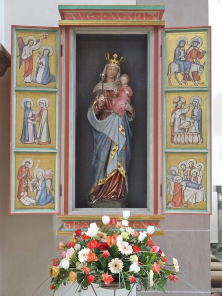 An historisch bedeutsamem Inventar besitzt die Kirche ein Versperbild aus dem 15. Jahrhundert. Diese „Vöppstedter Pietà“ genannte Darstellung stammt aus der alten Vöppstedter Kirche, die 1281 zerstört worden war. Aus der gleichen Zeit stammen vier Heiligenfiguren im südlichen Seitenschiff. An der Nordostwand des Mittelschiffes steht ein 1954 geschaffener Flügelaltar mit einer Statue der „Maria Himmelskönigin“, die der Kirche 1888 geschenkt worden war. Das Innere der Kirche ist bewusst schlicht gehalten. Einziger Schmuck ist das Fresko von der Himmelfahrt Mariens im Kirchenchor. Dieses war lange verborgen und wurde erst 1988 wieder freigelegt.