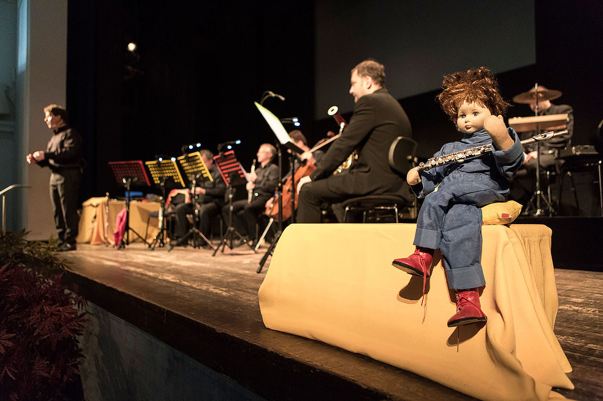 Mit dem Kammerensemble des Freien Landestheaters Bayern in der Besetzung Flöte, Oboe, Klarinette, Fagott, Horn, Violoncello, Klavier, Fidel, Psalter, Schellen und mittelalterliche Flöten.